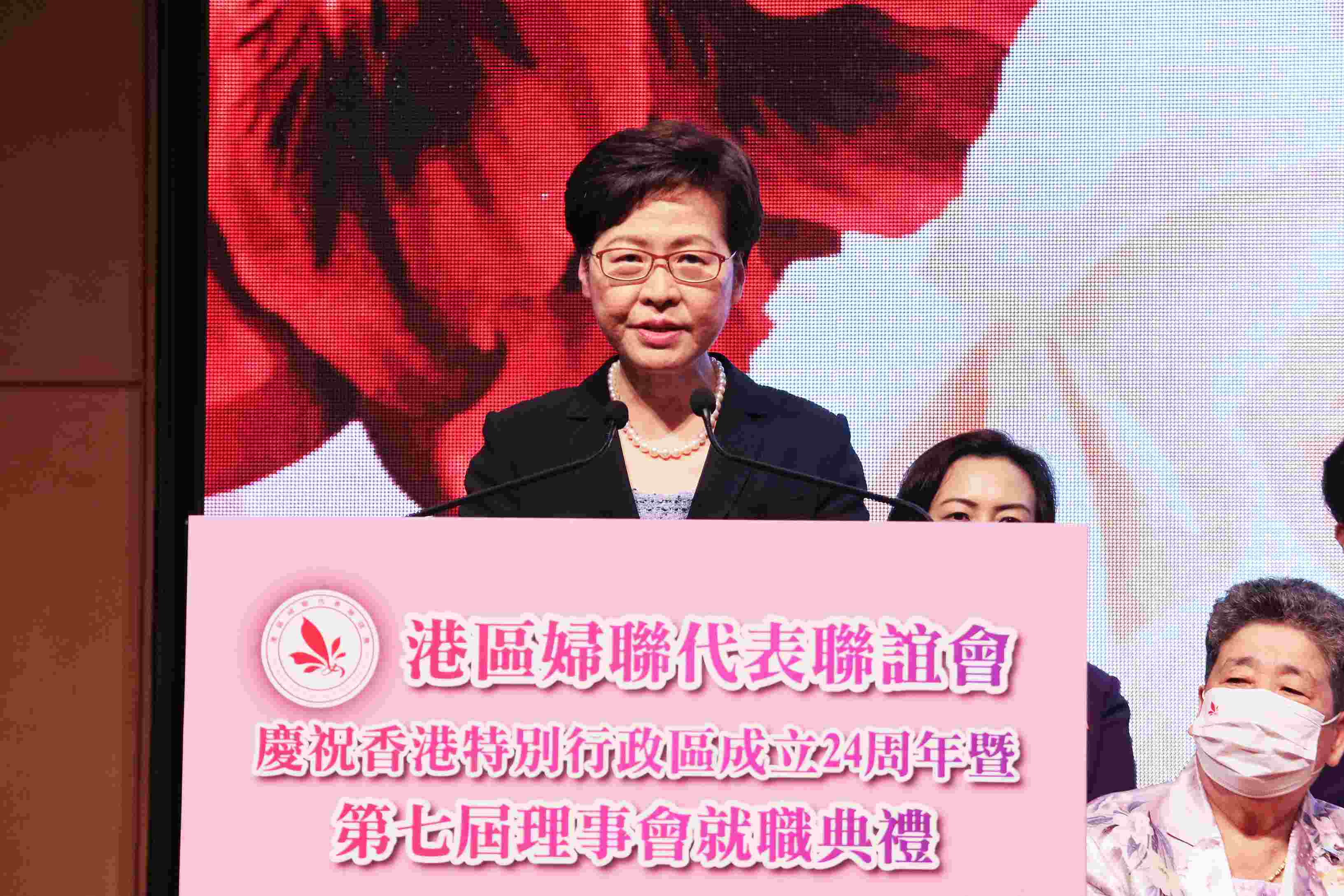 林鄭月娥致辭時說,港區婦聯匯聚了香港各界的女性精英,積極倡導性別平等,維護婦女兒童權益,關注弱勢社群,促進社會和諧,並致力加強與內地婦聯的交流溝通與合作。她肯定了該會支持特區政府依法施政所作出的貢獻。她指出,過去一年,全國人大先後制定了香港國安法,又完善了特區選舉制度。落實過程中,該會成員積極發聲,舉辦專題講座,向社會普及新規,增進了社會了解和認同。