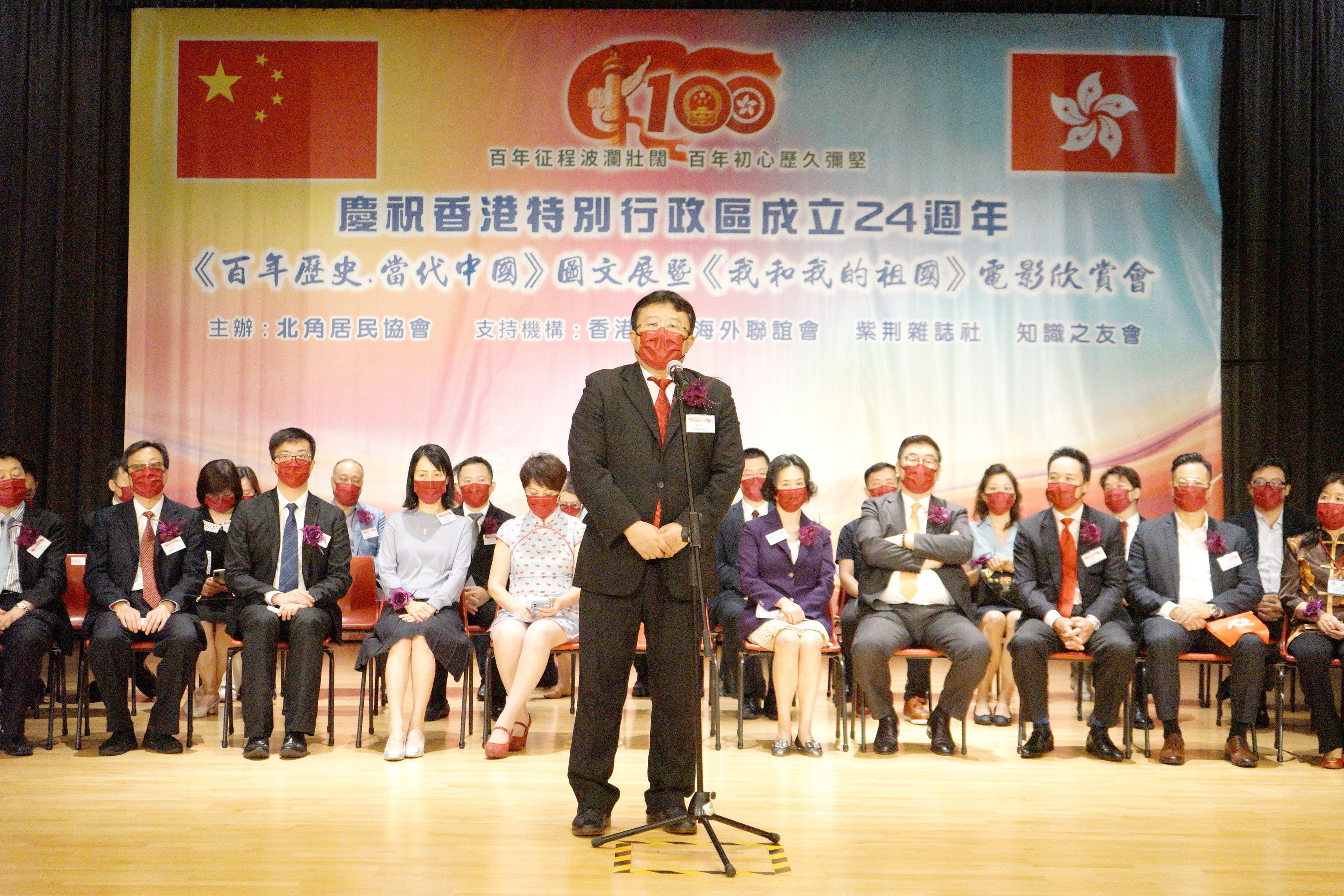 由北角居民協會主辦,紫荊雜誌社、香港北京海外聯誼會、知識之友會協辦的《百年歷史當代中國》圖片展暨《我和我的祖國》電影欣賞會開幕式,25日假北角社區會堂舉行。中聯辦港島工作部副部長范克勝、北京市政協常委何超瓊、東區民政事務助理專員彭明軒、北角居民協會主席李莉應邀主禮並發表致辭。現場不少家庭揮舞國旗及區旗,一片紅海,氣氛熱烈。
