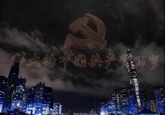 城市中心區樓宇燈光全面亮起,2021架無人機點亮夜空,上演了一場美輪美奐的視覺盛宴。與此同時,深圳黨史學習教育雲平台與「向黨致敬 為黨祝福」互動H5正式上線,將全市共同慶祝建黨百年的熱烈氛圍覆蓋到網絡端,掀起一場慶祝建黨百年的「雲」上熱潮。