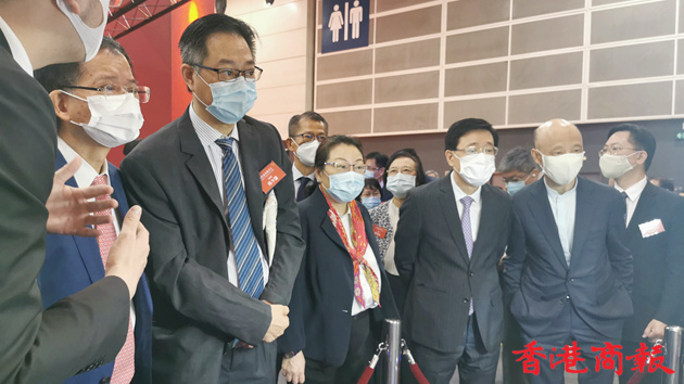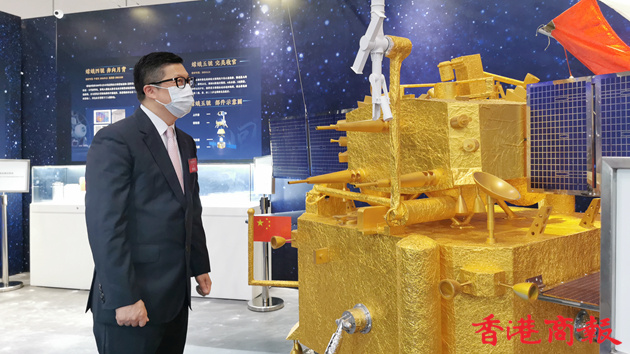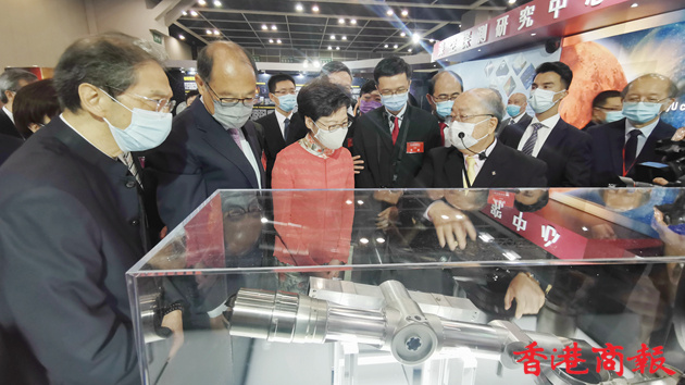 「時代精神耀香江」之百年中國科學家主題展暨月壤入港揭幕儀式,今日(26日)在灣仔會展舉行。行政長官林鄭月娥、新任政務司司長李家超、新任保安局局長鄧炳強等人出席展覽揭幕儀式。儀式結束後,林鄭等人一起參觀香港理工大學參与的國家航天工程項目,容啟亮教授在旁講解。李家超、鄧炳強及律政司司長鄭若驊等人也參觀了相關展品。今次亦是李家超、鄧炳強上任後,首次出席公開活動。(记者木子摄)