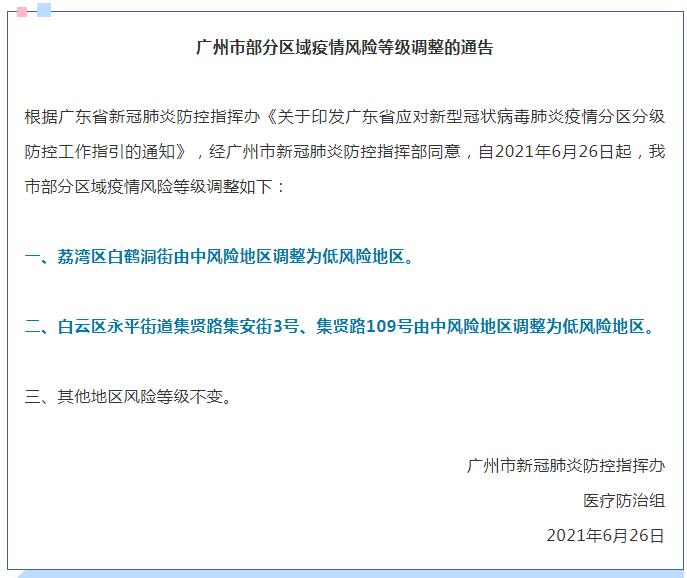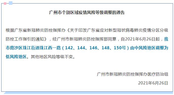 今天下午,广州市新冠肺炎防控指挥办医疗防治组发布通告,根据广东省新冠肺炎防控指挥办《关于印发广东省应对新型冠状病毒肺炎疫情分区分级防控工作指引的通知》,经广州市新冠肺炎防控指挥部同意,自2021年6月26日起,广州市南沙区珠江街道珠江西一路(142、144、146、148、150号),荔湾区白鹤洞街,白云区永平街道集贤路集安街3号、集贤路109号,均由中风险地区调整为低风险地区。其他地区风险等级不变。