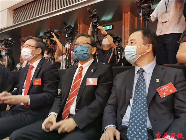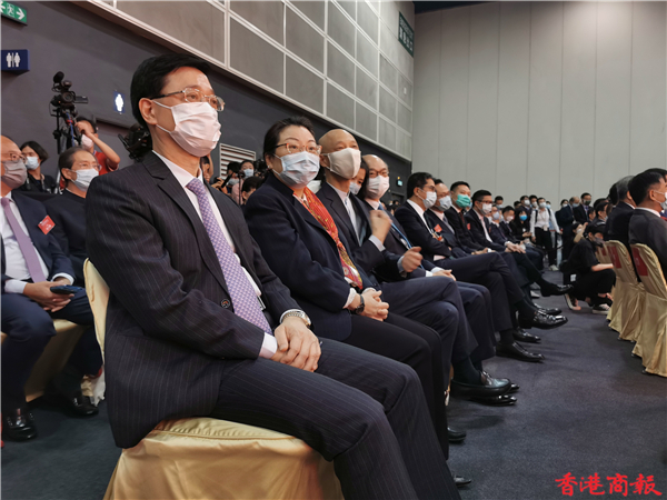 一眾嘉賓中,最受注目的當然是新上任的政務司司長李家超和保安局局長鄧炳強。李司長深色條紋西裝搭了一條紫色白點的領帶,一貫嚴肅的表情,很認真地看展覽,專注地聽理大教授容啟亮講解。