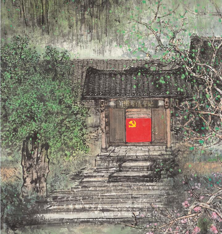 苟壩會議遺址是一座老式黔北農家三合院,傳統木結構的瓦房。看似普通的鄉村老宅,卻曾於此召開過具重大歷史意義的會議。蕭暉榮並沒有像大多數刻畫革命遺址的作品一樣細緻描繪會場細節,而是將之置入群山包圍的大環境之中,並着重刻畫春天草木茂盛的勃勃生機,在凸顯革命遺址歷史底蘊的同時,煥發出全新的時代內涵。畫家以晨曦寓意寄情,構思巧妙,加上題材獨特、筆墨精良,格外引人注目。