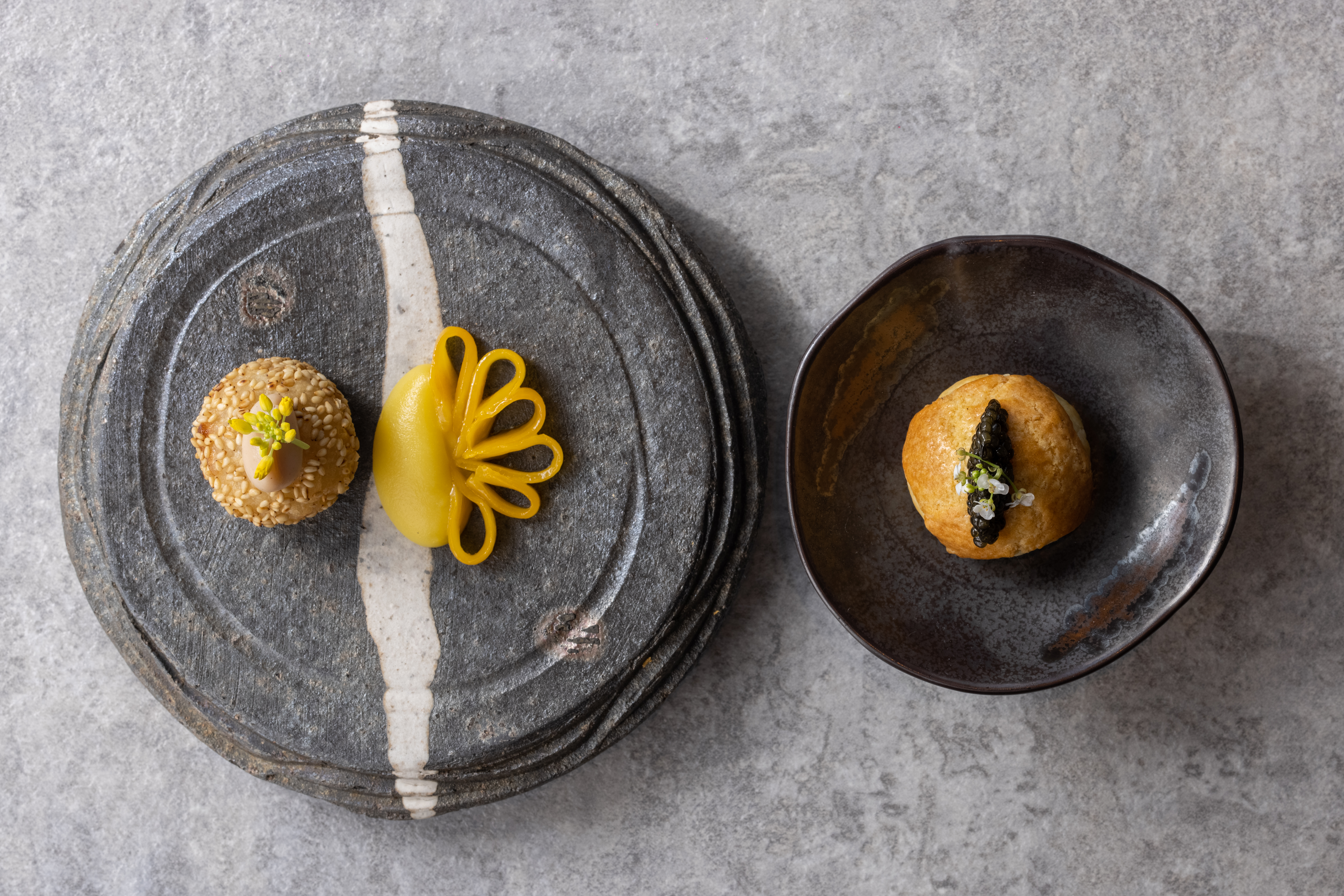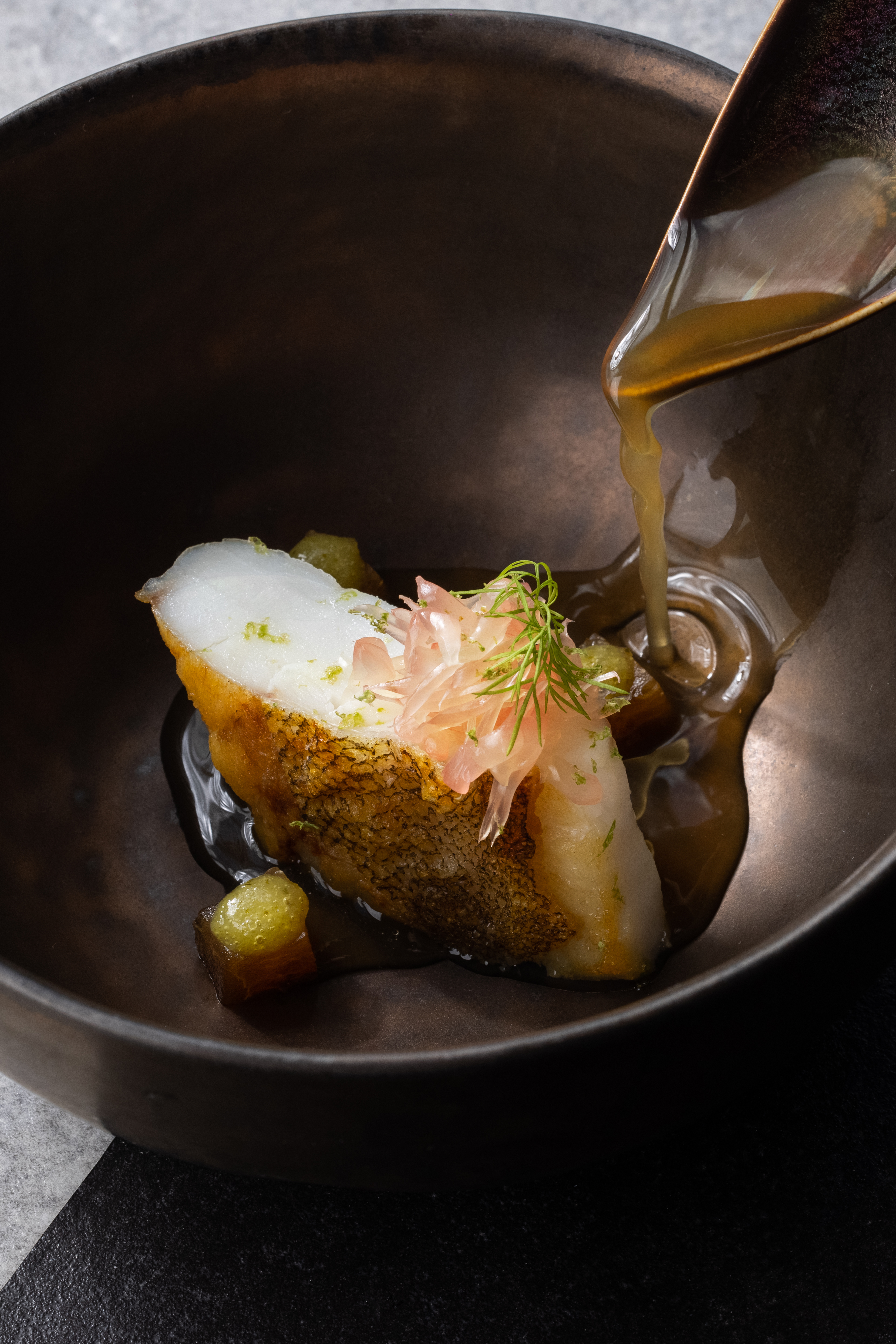 主廚以傳統中式手工製作柚皮的方法來烹調鰹魚汁柚皮,花上4天按步驟來處理:風乾、水煮、乾水,最後花上一天醃製,並以日本鰈魚 (Hata) 醃製兩天,伴以牛尾湯,再以日本柑橘酢橘 (Sudachi) 所製成的酸澀胡椒香醬汁作點綴。
