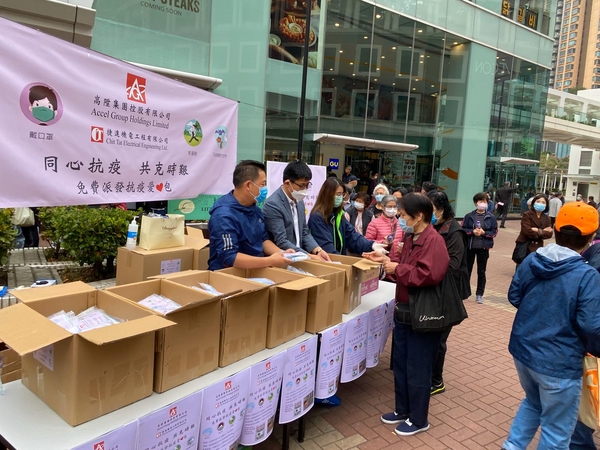 高陞集團主席及行政總裁高黎雄博士(左二)代表高陞集團向荃灣區長者派發防疫用品。