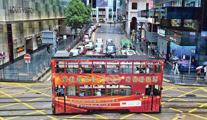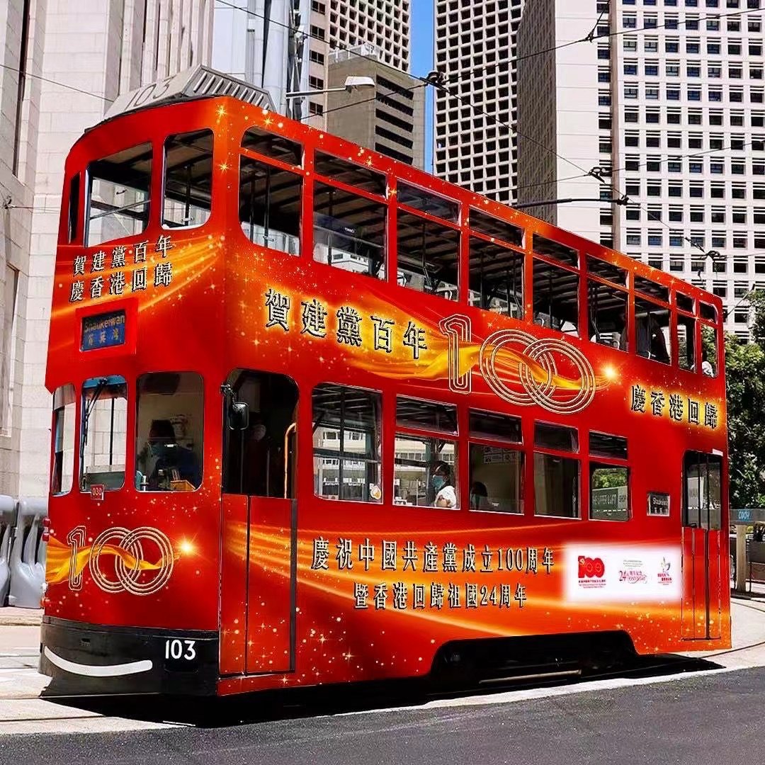 有電車車身噴上「賀建党百年 慶香港回歸」等慶祝標語。