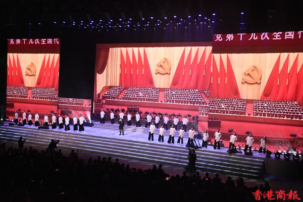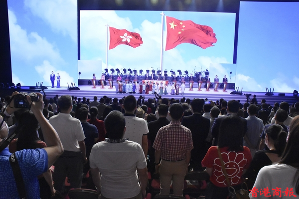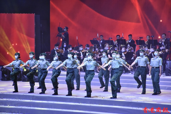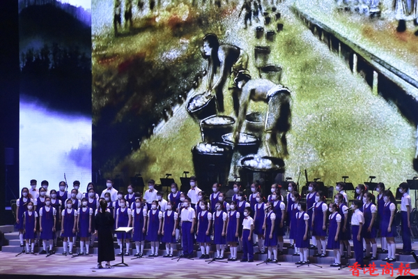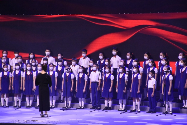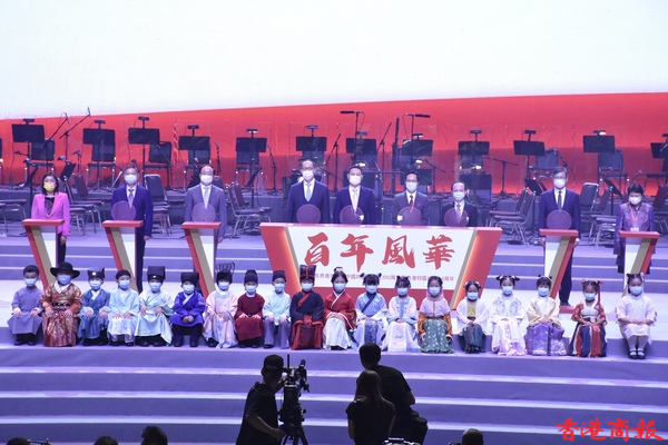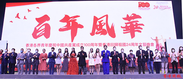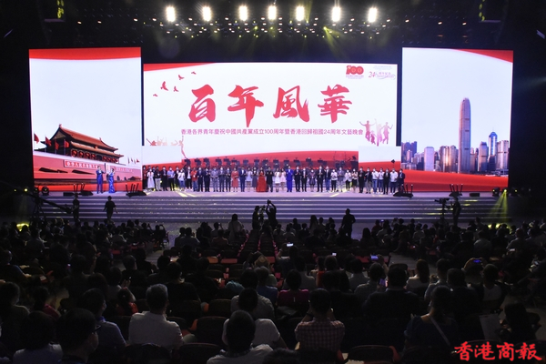 「百年風華」香港各界青年慶祝中國共產黨成立100周年暨香港回歸祖國24周年文藝晚會6月30日假香港體育館舉行。民政事務局局長徐英偉、中聯辦社會工作部部長梁建、青年工作部副部長張志華、香港各界青少年活動委員會執行主席蔡德昇、大灣區共同家園青年公益基金主席黃永光等嘉賓,以及來自400多個青年團體的3000餘名青年代表觀看演出。