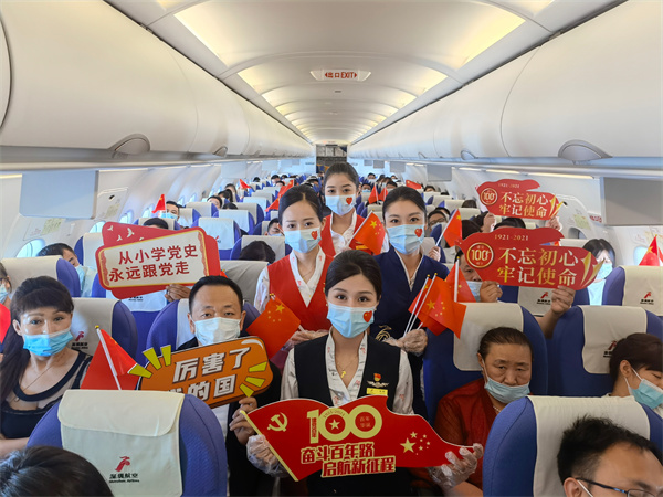 2021年中國共產黨迎來百年華誕,百年征程波瀾壯闊,百年初心歷久彌堅,為慶祝建黨一百周年,深航客艙服務部聯合哈爾濱、南寧、泉州、南京等分公司客艙服務部齊心策劃舉辦了機上「萬米藍天講黨史,紅色文化進客艙」機上主題航班活動。活動選擇了北京、南昌、西安、南京、宜賓等紅色航線,當天執行活動航班的乘務員均為中國共產黨員,他們以飽滿的精神面貌和熱情洋溢的服務態度迎接着每一位旅客,並為旅客發放了國旗、黨旗,在萬米高空與旅客共同慶祝黨的百年華誕。