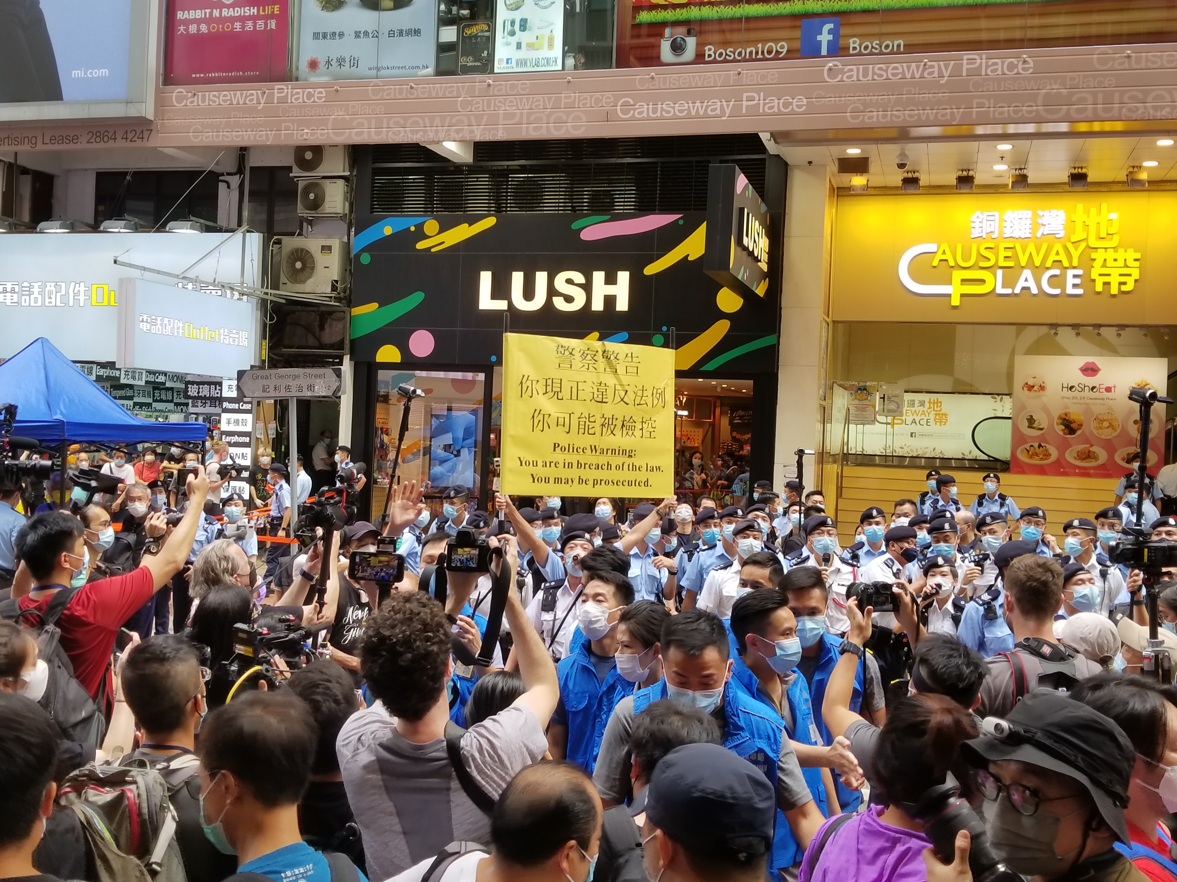 下午近4時,警方在記利佐治街舉起黃旗,警告在場人士現正違反法例,並可能被檢控。部分警員一度進入Fashion Walk商場內,并在商場門口拉起封鎖線,要求在場人士離開。警方其後退到商場門外,並收起封鎖線。(顶圖来源:商台)