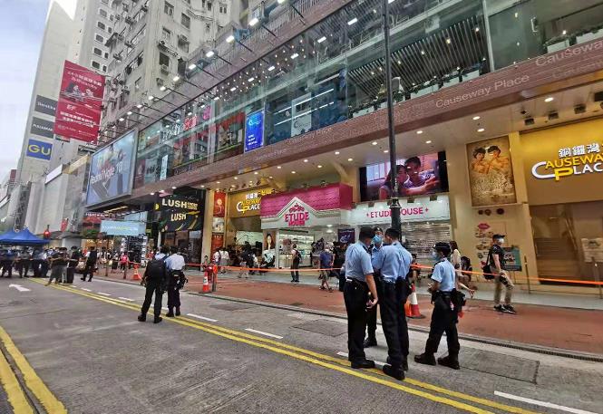 警方在銅鑼灣名店坊外舉起黃旗,並一度封鎖名店坊。记者区天海摄