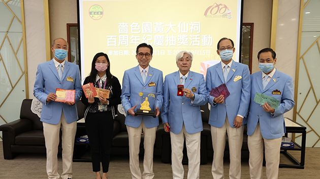 嗇色園主席馬澤華、監院李耀輝、副主席盧燊河、余君慶與黎澤森及行政總幹事冼碧珊一同公布嗇色園百周年紀慶抽獎活動詳情。