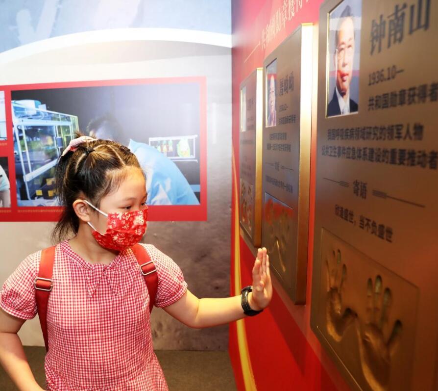 7月2日,一名女孩在「共和國勳章獲得者手模」的展板前參觀。新華社