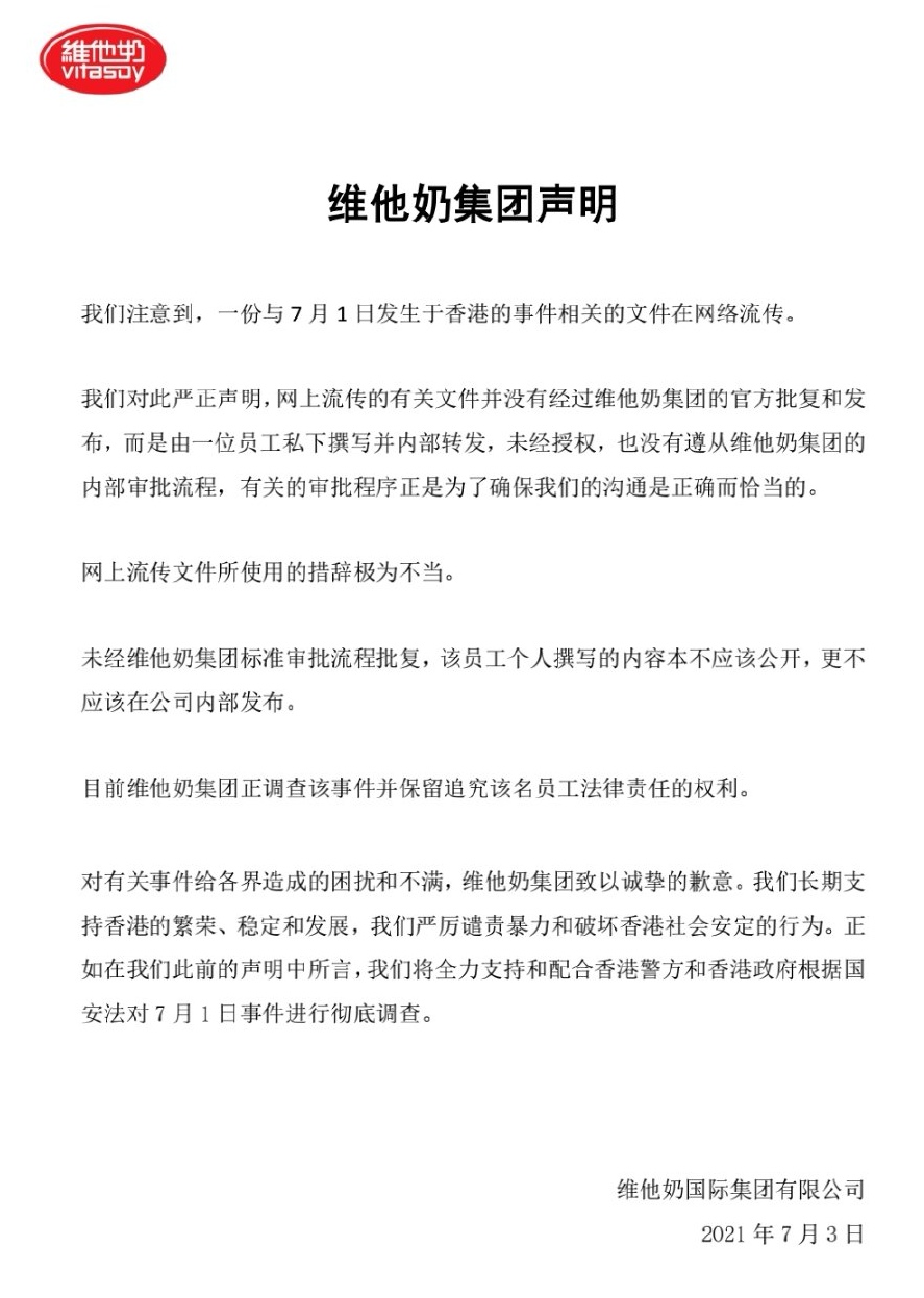 維他奶集團今日(3日)中午前在新浪微博發表最新聲明,稱昨日在網上流傳,有關7月1日襲警案疑兇梁健輝的內部文件,是由一位員工私下撰寫並內部轉發,未經授權,也沒有遵從維他奶集團的內部審批流程。