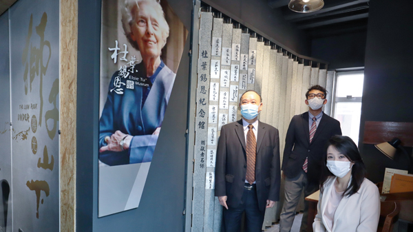 慕光英文書院校董會主席張雅麗(右)、校監黃華康(左)、校長梁超然(中)介紹杜葉錫恩紀念館暨慕光校史館。(記者 馮瀚文攝)
