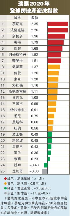 但分析亦指,由於利率仍維持在極低水平,而且現時貸款條件總體而言較以往嚴格,故還未有明顯會引發樓市泡沫爆破的觸發點,全球房地產前景與其說會崩潰,不如說將會冷卻。不過,全球樓市同步上升所產生的風險較大,現時情況是,一旦借貸成本真的開始上揚,房地產市場及維持金融穩定的一些廣泛措施,將面臨重大考驗。總之,投資者須注視資金流向突變,美國以至環球資產價格走向可能出現逆轉。