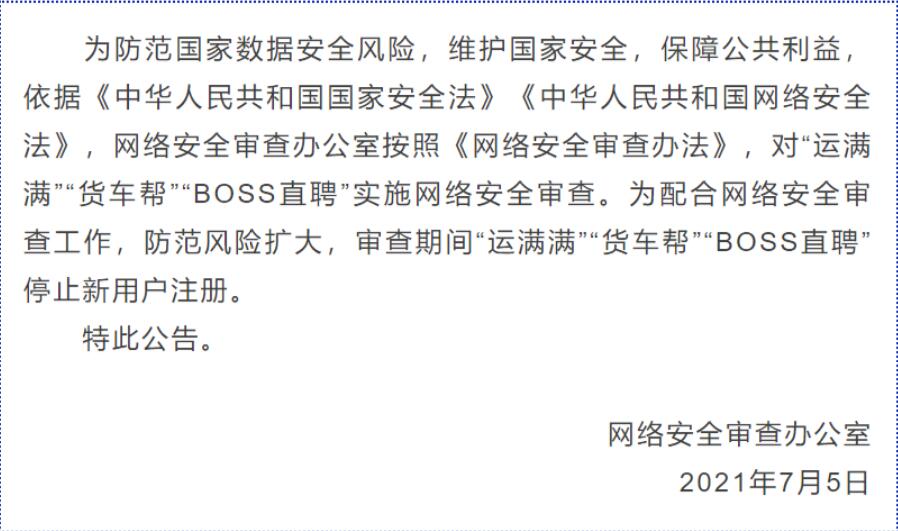 據「網信中國」微信公眾號顯示,為防範國家數據安全風險,維護國家安全,保障公共利益,依據《中華人民共和國國家安全法》《中華人民共和國網絡安全法》,網絡安全審查辦公室按照《網絡安全審查辦法》,對「運滿滿」「貨車帮」「BOSS直聘」實施網絡安全審查。為配合網絡安全審查工作,防範風險擴大,審查期間「運滿滿」「貨車帮」「BOSS直聘」停止新用戶注冊。