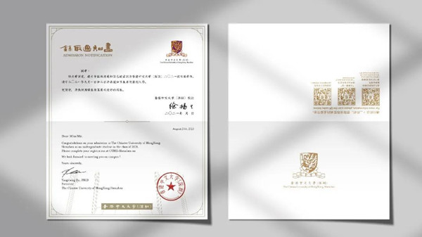 錄取通知書信封與紙張選用的是帶有珠光、輕盈但又堅硬的魔力卡材質,「錄取通知書」字樣及大學logo均採用了燙金工藝,配以該校校長徐揚生書法和中英對照的內容,完美體現了大學「結合傳統與現代,融會中國與西方」的辦學使命。打開禮盒,映入眼帘的東方之窗和西方之窗的造型,代表着大學對人才的培養理念:學貫中西、匯通古今、融合文理。其中帶有東方之「窗」設計的香盒,是送給學子的第一份禮物。點燃檀香,縷縷升起的香氣,仿佛飄出窗外的書香。而具有西方之「窗」設計的膠片,則帶學子們領略校園之美,有身臨其境之感,彷佛置身其中。當學生舉起膠片,面朝光明,港中大(深圳)的風景即被點亮,這是學生與校園美好的初見。
