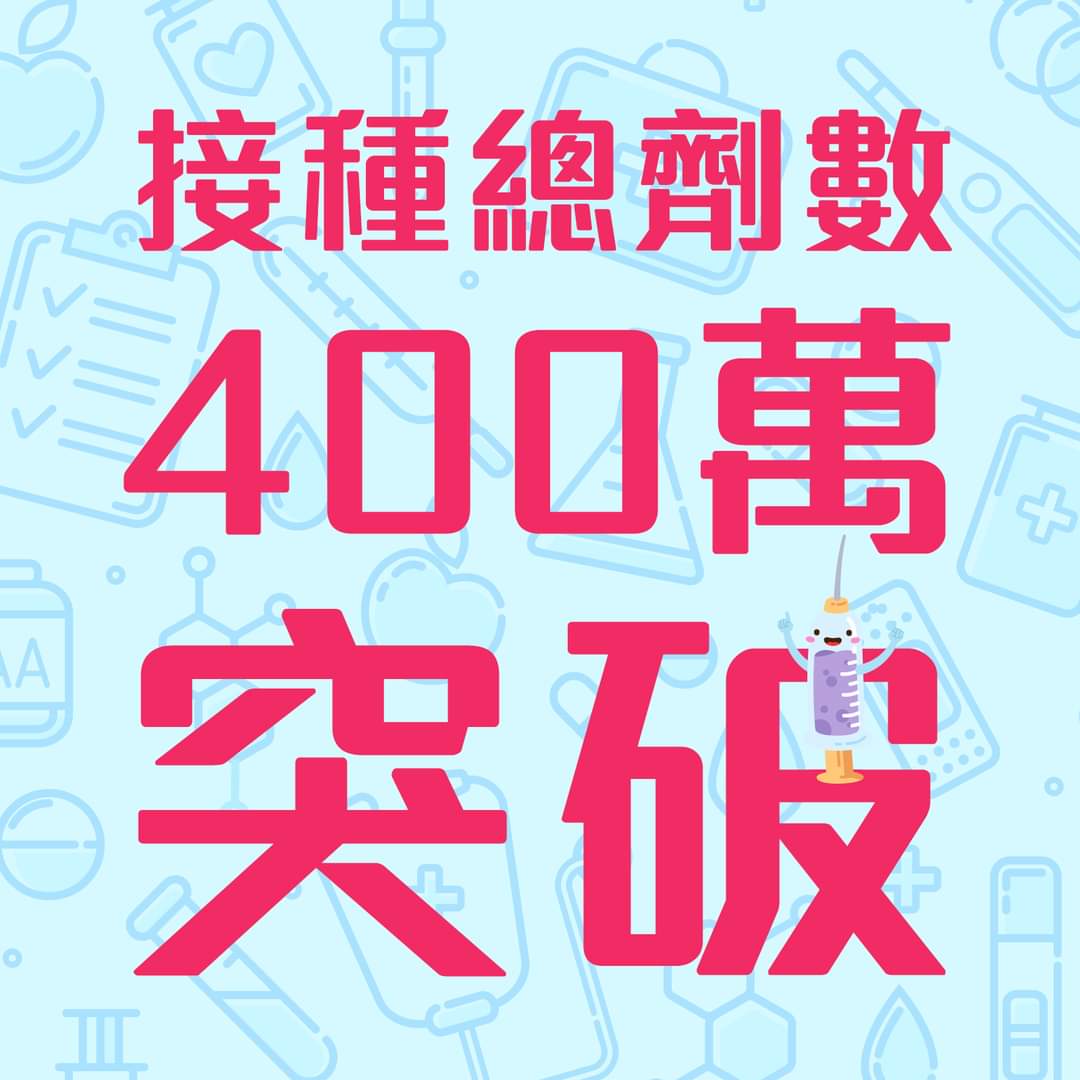 公務員事務局局長聶德權今晚(5日)在社交網站表示,疫苗接種總劑次突破400萬!已接種第一針的人口達240萬人,佔可接種人口35.4%。他說,若接種人口能盡快翻一番,便可達七成接種率,為恢復正常生活、通關、出行、面授課等創造基本條件。