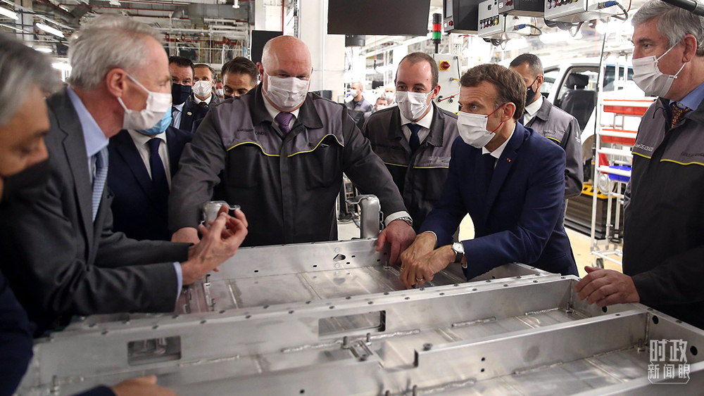 2021年6月28日,馬克龍(右二)在參觀法國北部城市杜埃附近的工廠時,對中國企業將在這裏投資建設電池工廠表示歡迎。(圖源:視覺中國)