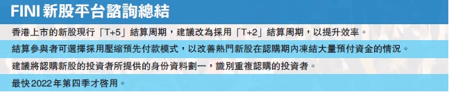 諮詢總結對新股交易時間表、IPO預設資金機制等方面提出修訂建議,其中就現行香港上市的新股「T+5」結算周期,諮詢文件建議將有關周期縮短至「T+1」。但經諮詢市場並考慮市場意見及營運上的需要後,港交所將落實推展FINI作為日後所有新股的統一處理平台,但會先行採用「T+2」結算周期(新股定價日與上市日相隔2個交易日)。