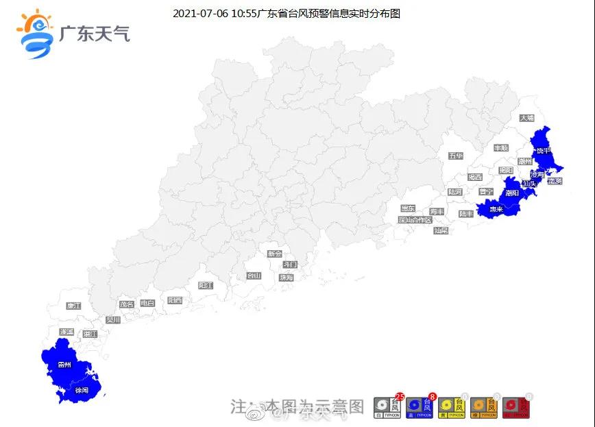 截至7月6日10時55分,廣東省颱風預警已經增加到33個(25個白色、8個藍色預警)。