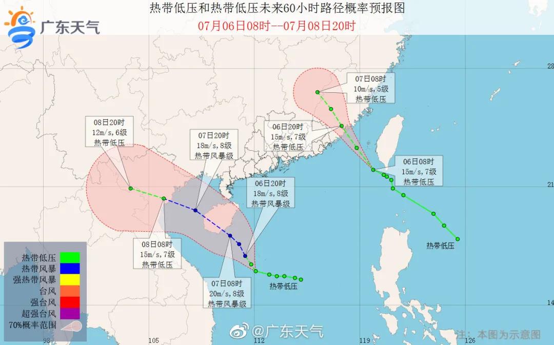 預計,熱帶低壓將以30公里左右的時速向西北方向移動,有可能發展為今年第六號颱風(熱帶風暴級),6日傍晚前後登陸粵東到閩南沿海市縣。