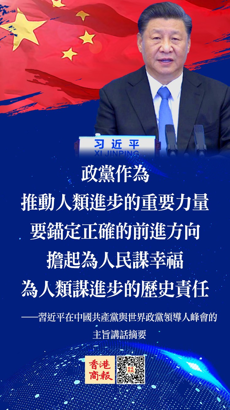 中共中央總書記、國家主席習近平6日在北京以視頻連線方式出席中國共產黨與世界政黨領導人峰會,並發表題為《加強政黨合作 共謀人民幸福》的主旨講話,強調政黨作為推動人類進步的重要力量,要錨定正確的前進方向,擔起為人民謀幸福、為人類謀進步的歷史責任。中國共產黨願同各國政黨一起努力,始終不渝做世界和平的建設者、全球發展的貢獻者、國際秩序的維護者。