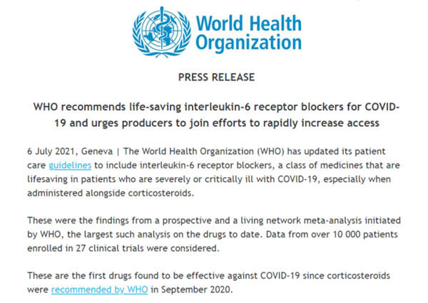 當地時間7月6日,世衛組織更新新冠肺炎患者護理指南,將白介素-6受體拮抗劑納入其中。世衛組織稱該藥物可挽救新冠肺炎重症和危重症患者生命,與皮質類固醇一同使用時尤為有效。