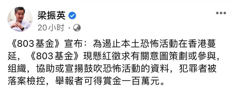 全國政協副主席、前香港特首梁振英昨日(6日)在社交平台發文表示,由其創辦的「803基金」宣布,為遏止本土恐怖活動在香港蔓延,「803基金」現懸紅徵求有關意圖策劃或參與,組織,協助或宣揚鼓吹恐怖活動的資料,犯罪者被落案檢控,舉報者可得賞金一百萬元。