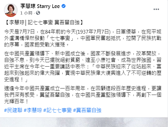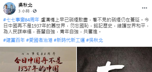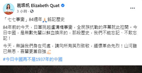 立法會議員葛珮帆發文表示,84年前的今天,日軍挑起盧溝橋事變,全民族抗戰的序幕就此拉開。今日中國,是無數先輩以鮮血換來的,那段歷史,我們不能忘記、不敢忘記!