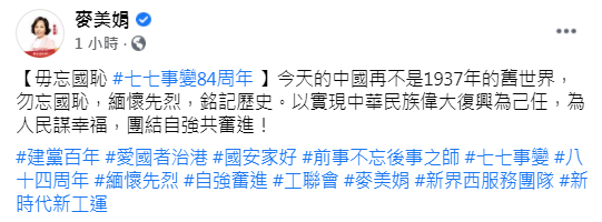立法會議員麥美娟發文表示,今天的中國再不是1937年的舊世界,勿忘國恥,緬懷先烈,銘記歷史。以實現中華民族偉大復興為己任,為人民謀幸福,團結自強共奮進!