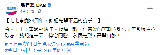 民建聯亦發文表示,今天,七七事變84周年。硝煙已散,但曾經的苦難不能忘,無數犧牲不敢忘!銘記這一天,悼念同胞,永懷先烈,吾輩自強!