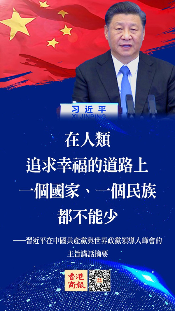 中共中央總書記、國家主席習近平6日在北京以視頻連線方式出席中國共產黨與世界政黨領導人峰會,並發表題為《加強政黨合作 共謀人民幸福》的主旨講話。習近平指出,我們要擔負起促進發展的責任,讓發展成果更多更公平地惠及各國人民。發展是實現人民幸福的關鍵。在人類追求幸福的道路上,一個國家、一個民族都不能少。