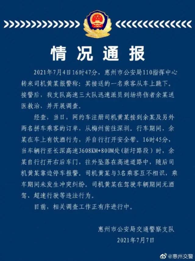 2021年7月4日16時47分,惠州市公安局110指揮中心轉來司機黃某報警稱:其接送的一名乘客從車上跳下。接警後,支隊高速三大隊迅速派員到場將傷者余某送醫救治,並開展調查。