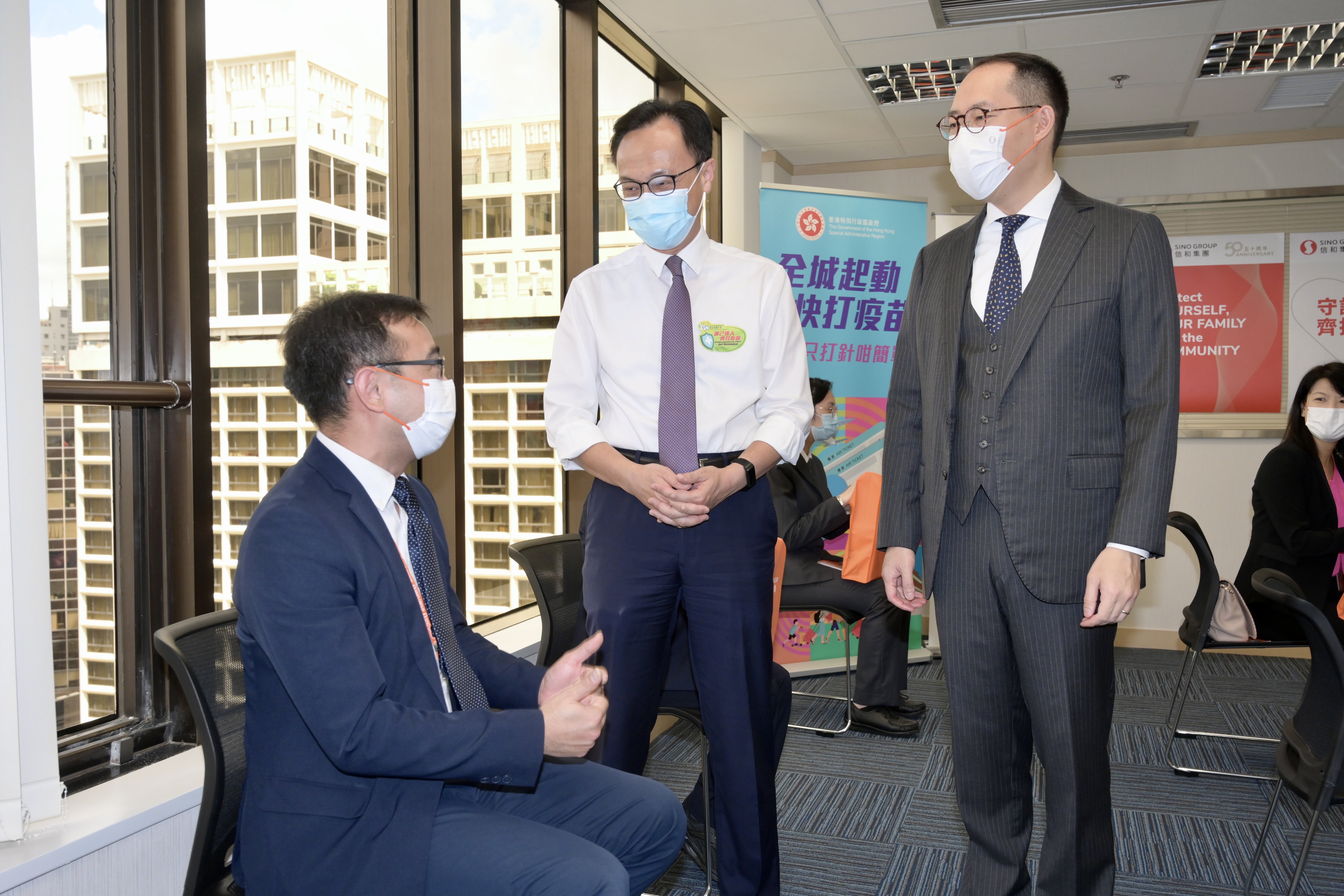 聶德權與信和集團副主席黃永光跟完成接種新冠肺炎疫苗職員交談。