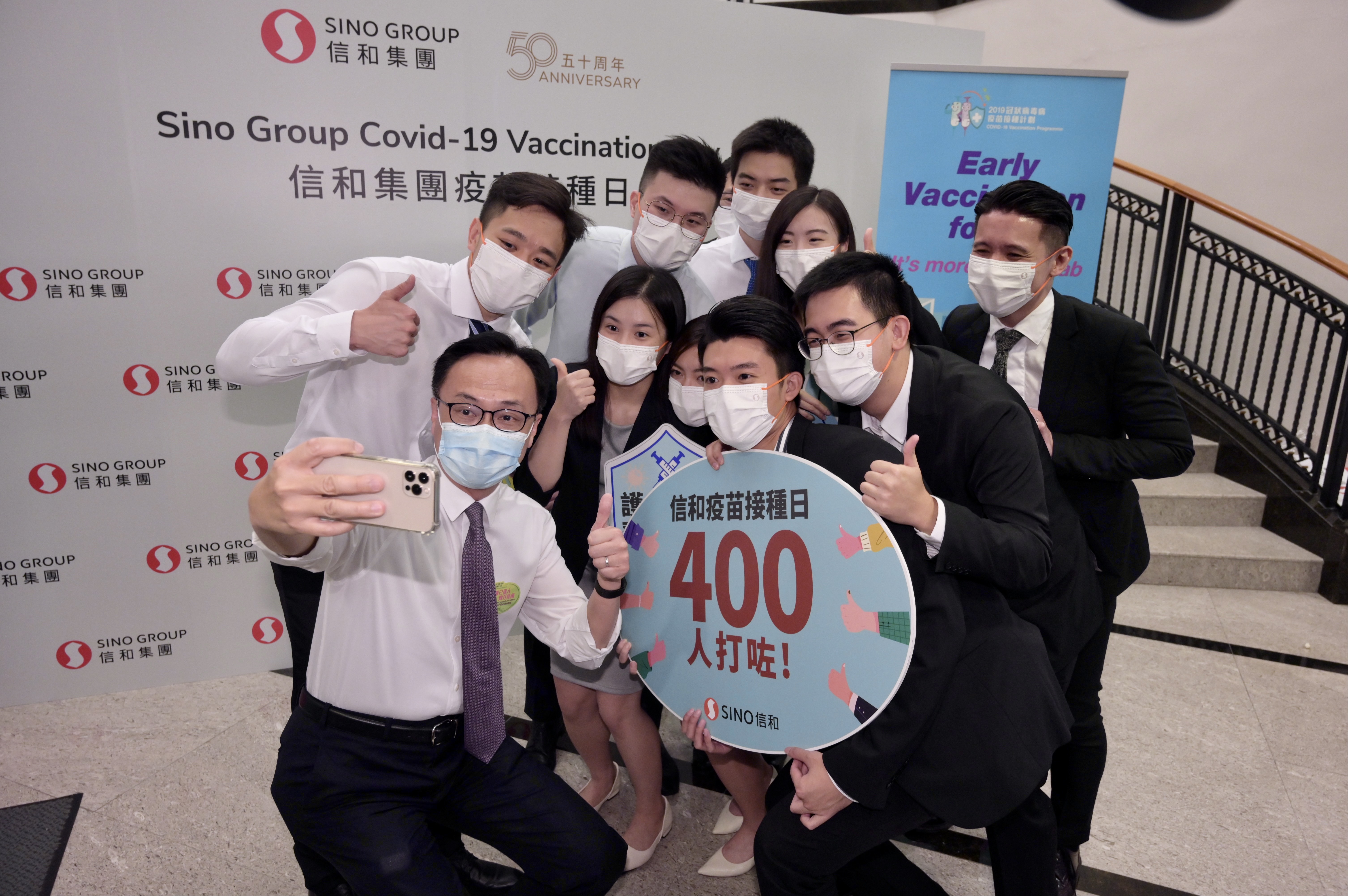 頂圖:聶德權、信和集團副主席黃永光、信和集團聯席董事黃永龍、信和集團聯席董事兼人力資源總監廖懿妮及一眾員工一同支持新冠肺炎疫苗接種計劃。