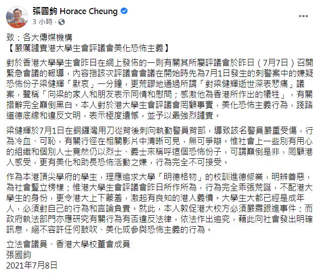 民建聯立法會議員、香港大學校董會成員張國鈞發表嚴正聲明,嚴厲譴責港大學生會評議會美化恐怖主義。他對於香港大學學生會昨日在網上發布的一則有關其所屬評議會於昨日召開緊急會議的報道,內容指該次評議會會議在開始時先為7月1日發生的刺警案中的嫌疑恐怖份子梁健輝「默哀」一分鐘,更荒謬地通過所謂「對梁健輝逝世深表悲痛」議案,聲稱「感激他為香港所作出的犧牲」,有關措辭完全巔倒黑白。