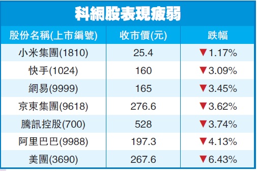 除科網及「中概股」外,生物科技、互聯網醫療、醫療器械同樣急瀉。其中藥明生物(2269)急瀉4.83%,收報128元;藥明康德(2359)急瀉4.65%,收報170.4元;京東健康(6618)急瀉4.95%,收報99.8元;微創醫療(853)跌3.08%,收報64.55元。
