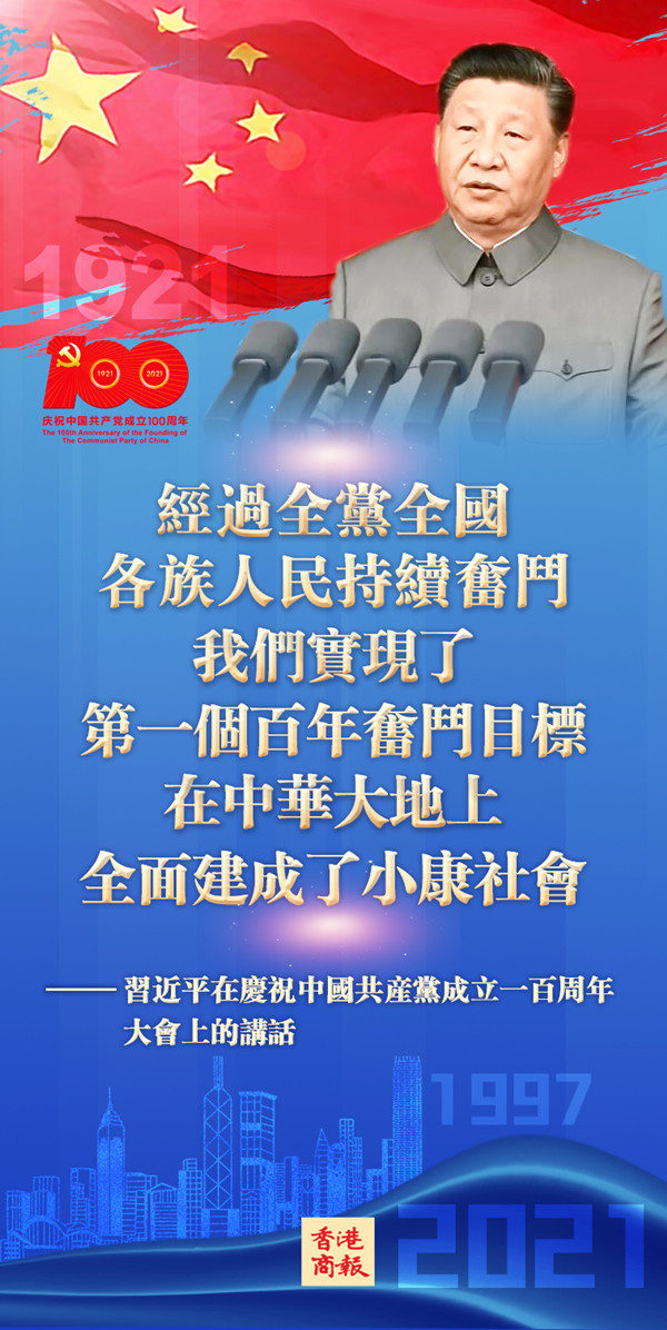 慶祝中國共產黨成立100周年大會7月1日在北京天安門廣場舉行,中共中央總書記、國家主席、中央軍委主席習近平發表重要講話。習近平在天安門城樓莊嚴宣告:經過全黨全國各族人民持續奮鬥,我們實現了第一個百年奮鬥目標,在中華大地上全面建成了小康社會,歷史性地解決了絕對貧困問題,正在意氣風發向着全面建成社會主義現代化強國的第二個百年奮鬥目標邁進。