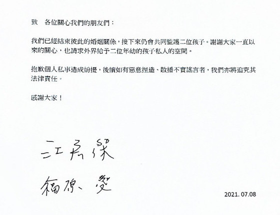 福原愛和江宏傑結婚4年多,育有一雙可愛的兒女,3月卻爆出婚變風波,人在日本的福原愛更被拍到和男子過夜疑似出軌,日媒後續也報道福原愛其實長期遭江家霸淩等,江宏傑4月最終鐵了心向高雄法院訴請離婚,孩子的撫養權戰也開打,時隔2個月,法院判決結果終於出爐。夫妻倆也共同發聲明表示:「致各位關心我們的朋友們,我們已經結束彼此的婚姻關係,接下來仍會共同監護二位孩子。謝謝大家一直以來的關心,也請求外界給予二位年幼的孩子私人的空間。抱歉個人私事造成紛擾,後續如有惡意捏造、散播不實謠言者,我們亦將追究其法律責任。」