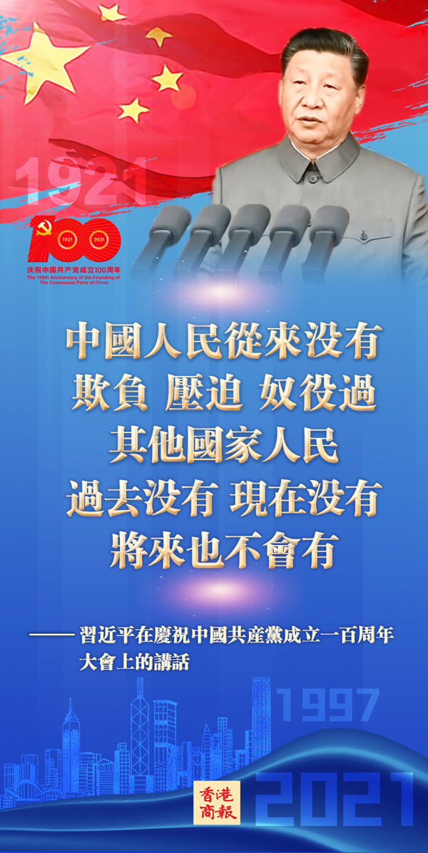 慶祝中國共產黨成立100周年大會7月1日在北京天安門廣場舉行,中共中央總書記、國家主席、中央軍委主席習近平發表重要講話表示,中國人民從來沒有欺負、壓迫、奴役過其他國家人民,過去沒有,現在沒有,將來也不會有。同時,中國人民也絕不允許任何外來勢力欺負、壓迫、奴役我們,誰妄想這樣干,必將在14億多中國人民用血肉築成的鋼鐵長城面前碰得頭破血流!