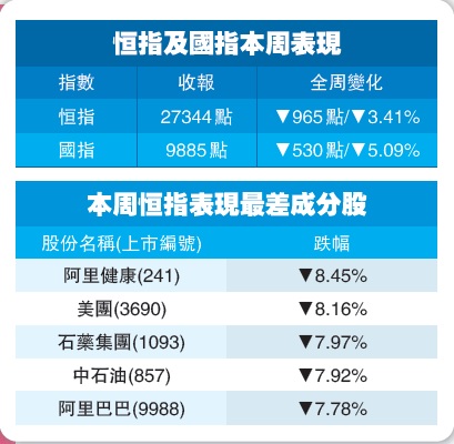 恒指結束8連跌,9日收市彈191點,收報27344點,成交輕微縮至1867億元。本周港股累挫965點,分析稱港股技術上已見超賣,有望開展技術反彈,但要升至27700點方能確認回穩。否則,港股仍有機會下破250天線(27117點),陷入技術熊市。