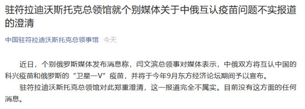 中國駐符拉迪沃斯托克總領事館微信公眾號7月12日發文稱:近日,個別俄羅斯媒體發布消息稱「閆文濱總領事對媒體表示,中俄雙方將互認中國的科興疫苗和俄羅斯的『衛星一V』疫苗,並將於今年9月東方經濟論壇期間予以宣布」。