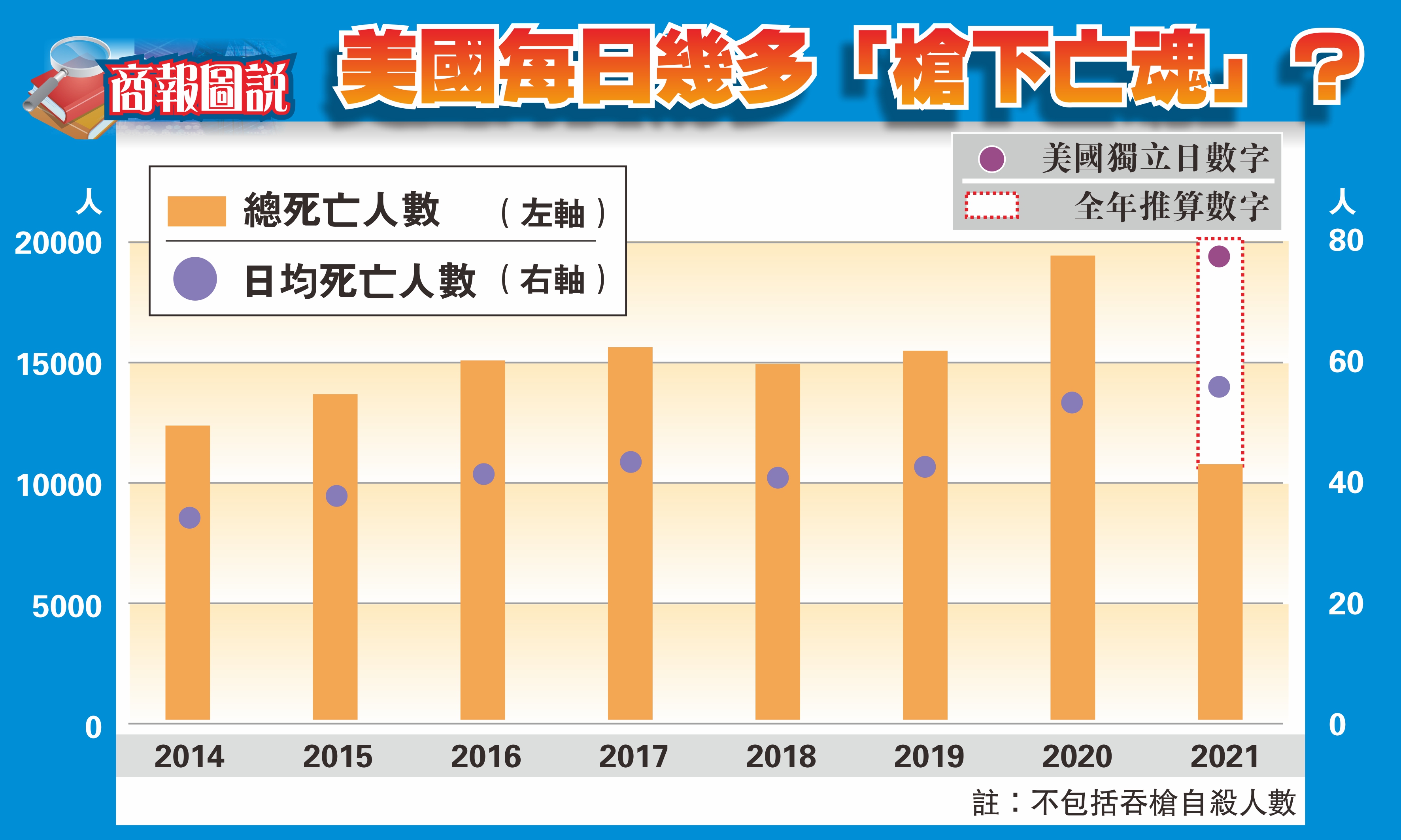 截至2021年7月12日,美國已有10709人在槍擊案中死亡,日均數字高約55.5人;如果下半年情況沒有改善,今年總死亡人數將首次突破20000人。而美國獨立日三天時間,日均「槍下亡魂」竟高近77.7人,難怪有人形容這是電影所謂的「國定殺戮日」!