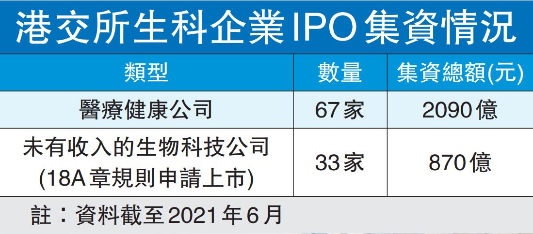 截至6月底,港交所已有67家醫療健康公司上市,首次公開招股集資額達2090億元,當中包括33家未有收入的生物科技公司(18A章規則申請上市),集資規模達870億元,反映香港生物科技生態圈的不斷成熟。