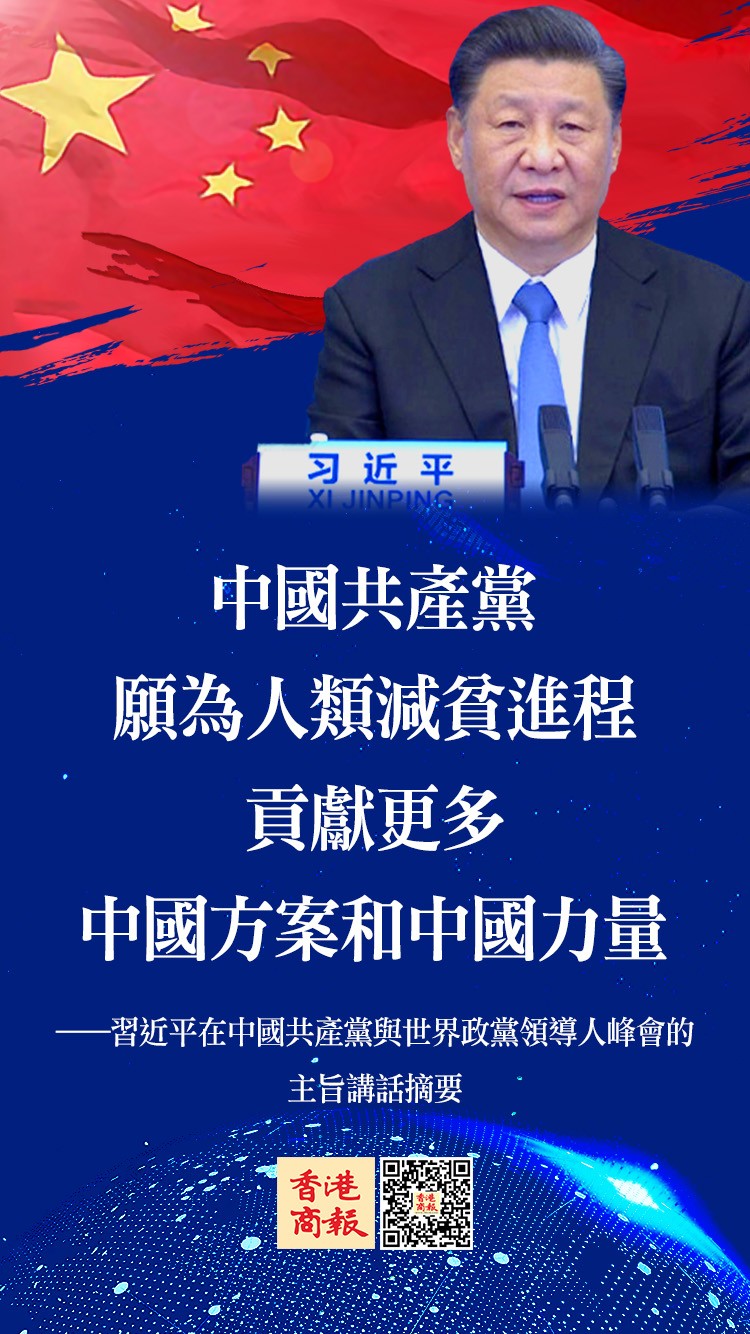 中國共產黨將履行大國大黨責任,為增進人類福祉作出新貢獻。消除貧困是各國人民的共同願望,是各國政黨努力實現的重要目標。中共十八大以來,中國現行標準下9899萬農村貧困人口全部脫貧,提前10年實現《聯合國2030年可持續發展議程》減貧目標。中國共產黨願為人類減貧進程貢獻更多中國方案和中國力量。中國將全力支持國際抗疫合作,增強發展中國家疫苗可及性和可負擔性。中國將為履行碳達峰、碳中和目標承諾付出極其艱巨的努力,為全球應對氣候變化作出更大貢獻。中國將承辦《生物多樣性公約》第十五次締約方大會,同各方共商全球生物多樣性治理新戰略,共同開啟全球生物多樣性治理新進程。
