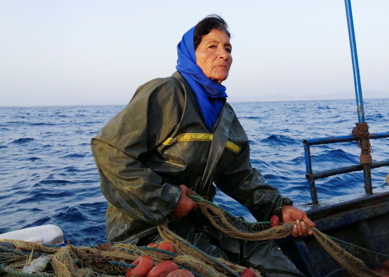 當地時間7月8日,在突尼斯,75歲的女漁民Zohra Trabelsi坐在她的船上,拉着漁網。