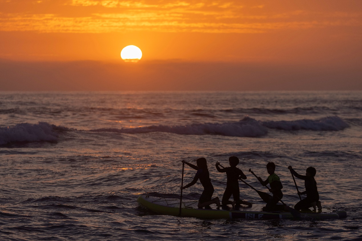 當地時間7月8日,在美國加州卡迪夫海灘,夕陽下一群孩子在海浪中划船。