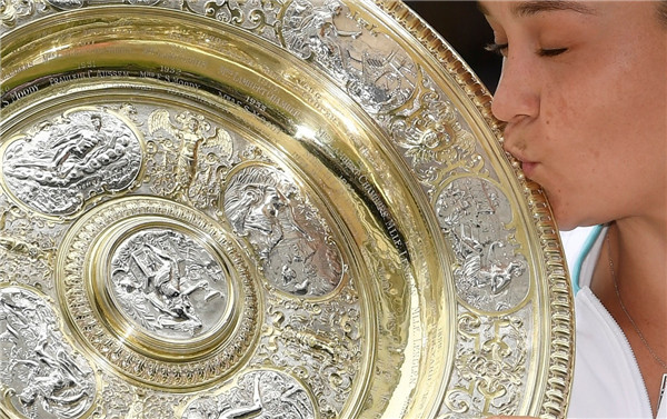 當地時間7月10日,澳洲選手芭蒂贏下英國溫布頓網球公開賽女單冠軍,並親吻獎盃「玫瑰露水盤」。