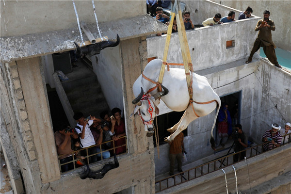當地時間7月11日,在巴基斯坦,在宰牲節前,人們拿着相機和手機拍下一頭被吊車從屋頂吊下的祭祀牛。